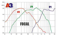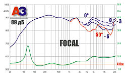 Нелинейные искажения в среднечастотном диапазоне у Focal ниже, чем у кого-либо из одноклассников. Искажения на басах тоже достаточно низкие на общем фоне. Расчётное значение силового фактора невысокое, 4,9 Тл м, но и подвижная система басового динамика (10,9 г) легче, чем у кого-либо из «коллег». Расчётная чувствительность без малого 90 дБ, и, кстати, среднечастотник по чувствительности уступает басу лишь 0,5, а не 6 дБ, как у кого-то из предшественников. График частотных характеристик по полосам имеет классический вид: где кончается полоса одного динамика, там начинается полоса следующего, никаких фантазий и извращений. СЧ-динамик начинает работать нетипично низко (для нашей акустики), поэтому к выбору ящика для него стоит отнестись внимательнее обычного. Небольшой провал на суммарной АЧХ точно соответствует зазору между полосами СЧ и ВЧ-головок: от 2 до 4 кГц. Его легко можно было убрать, повысив частоту среза фильтра НЧ среднечастотника, но, думается, разработчики сознательно пошли на его «консервацию», с тем, чтобы перевес в отдаче «серединки» над пищалкой был не так заметен на слух. В реальной инсталляции твитер лучше будет установить ближе к слушателю. Интересно, что на самых верхних частотах (от 18 кГц) излучение пищалки с обратным куполом становится практически ненаправленным.