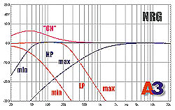 Центральная частота буста, действительно, 45 Гц, подъём, как и ожидалось, немного больше 6 дБ. Диапазон перестройки фильтра НЧ от 32 до 250 Гц. (Напомню, что по умолчанию крутизну спада считаем равной 12 дБ/окт.) Фильтр ВЧ перестраивается значительно шире, чем было обещано: от 45 до 1100 Гц. И правда, такой фильтр подойдёт для работы с СЧ/ВЧ-комбинацией, если, конечно, среднечастотник не купольный. Крутизна спада при высокой частоте среза 6 дБ/окт.