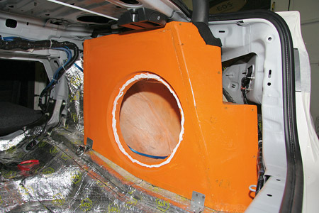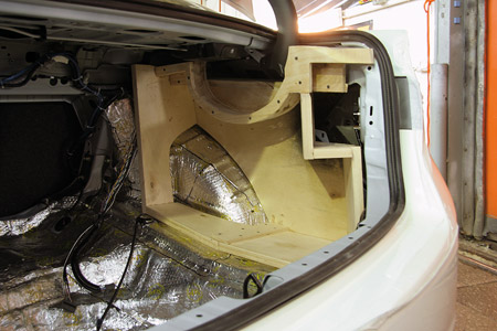 Корпус для саба сделан из фанеры многослойность которой различна в разных местах корпуса. Мы учли конструктивную особенность корпуса и сделали углубления для шарниров крышки багажника. По месту, из стеклопластика, отлили арку колеса. Защитную сетку сабвуфера устанавливать не стали – все сетки, примеренные для этой цели, смотрелись как инородные тела. Пришлось включать музыкально-художественную фантазию, и решение пришло в виде решётки «нотный лист». В таком багажнике картошку не возят, а сумки и прочие громоздкие вещи не провалятся в межнотные промежутки.