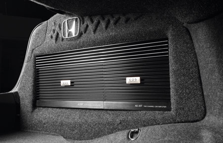 Сигнал, обработанный процессором, осуществляющим деление и проводящим необходимую коррекцию частотных полос, по возможно наиболее коротким (20 см, но не более) проводником подается на усилители атомобильные E.O.S. В системе их три: четырехканальный «фронтовик» E.O.S. AE-90F LE, автомобильные сабвуферы Alpine и двухканальник E.O.S. AE-35T LE V.2, в качестве тылового усилителя. Поскольку, тыловая автоакутика E.O.S. была на высоте и к ней не предъявлялись повышенные требования, можно было бы обойтись штатными усилителями «головы». Но они безмолвствовали при подключении к процессору, по этой причине и был добавлен двухканальник. Оба усилителя отличено вписались в линейку, и как бы образовали моноблок…
