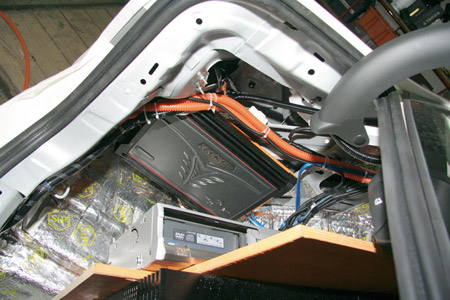 Сигналы от источников по оптоволоконным линиям поступают в аудиопроцессор нашедший своё место там же, где и усилители атомобильные E.O.S., в багажнике. Наличие его предсказуемо и очевидно. Поклонники чистого звука не приветствуют наличие процессора в системе но, сколько усилий требуется для достижения чистого звука. Сколько времени уходит на эксперименты с размещением и ориентацией звука. Не так много у нас было времени, тем более ожидалось достаточно много слуховых проб.