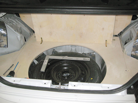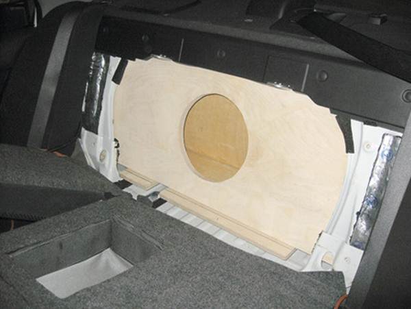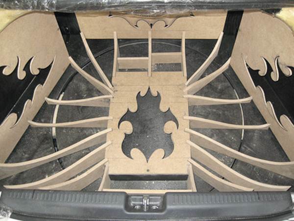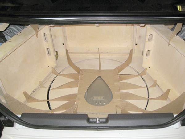 Для этого были закрыты все поверхности при помощи сложной конструкции, которая объединяет корпус сабвуфера, пол и корпуса для усилителей. Визуально объём багажника был сокращен незначительно — заполнили объём крыльев, место под задней полкой и слегка приподняли пол. Все компоненты установки «живут» не сами по себе, а как единая конструкция: плоские элементы сделаны из многослойной фанеры, криволинейная поверхность образована шпангоутом, на который натянута ткань. Технологии весьма традиционные, но способ их употребления довольно новаторский.