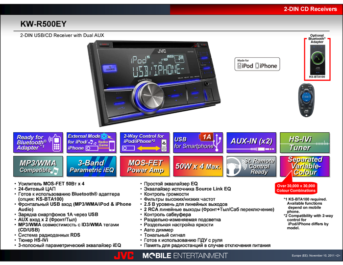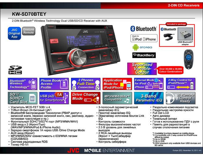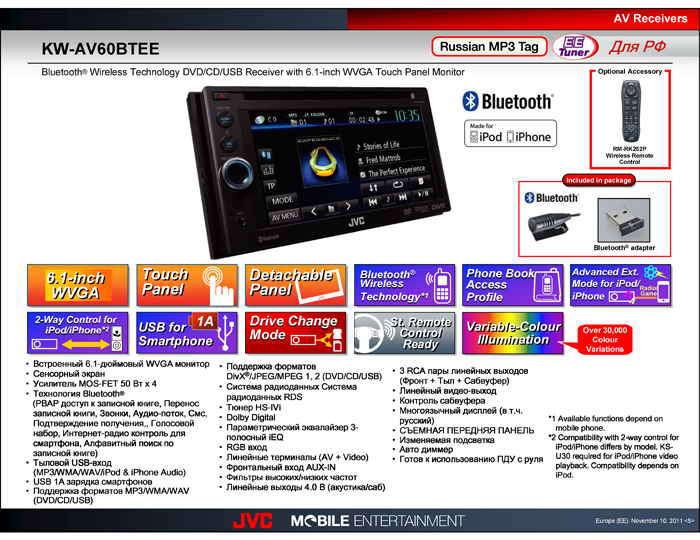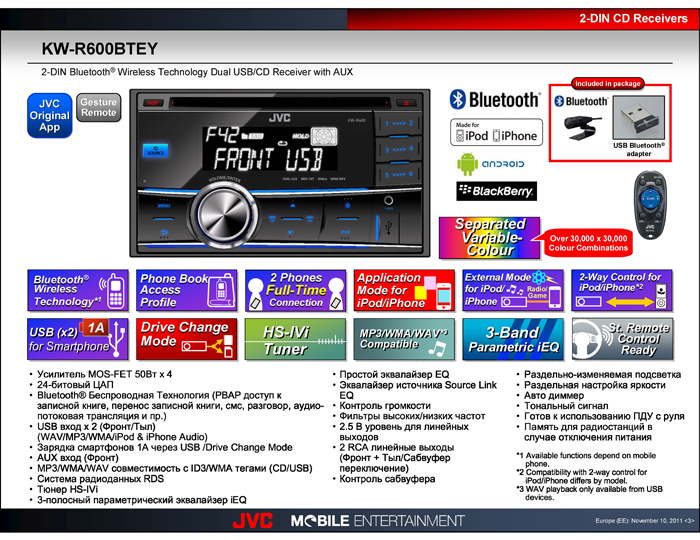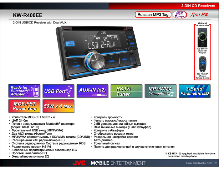 Из этой краткой презентации видно, что здесь представлены только простейшие двух диновые автомагнитолы без экрана (за исключением последней модели). Стоить они будут не дорого, функционально оснащены они достаточно хорошо, отлично смотрятся. Модель JVC KW-R400EE отличается от, JVC KW-R500EY возможностью выбора цвета подсветки экрана и подключения к штатным кнопкам на руле (все это есть у 500 модели), она в свою очередь отличается от JVC KW-R600BTEY наличием Bluetooth, которая в свою очередь отличается от JVC KW-SD70BTEY более крутым экраном с возможностью выбора подсветки. JVC KW-AV60BTEE новейшая магнитола с сенсорным экраном, Bluetooth и DVD. Как и у предыдущей модели, экран у этой тоже будет высокого разрешения. Естественно у фирмы есть и новые обычные автомобильные магнитолы, а так же аппараты с семи дюймовым экраном и возможностью воспроизведения DVD. Про них, возможно, будет написан новый обзор.