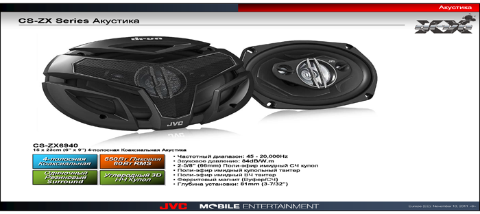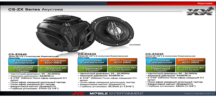 Автоакустика, как и уже несколько лет (и не только у JVC) отличается только внешним видом, поэтому подробно останавливаться на ней не будем. Скажем лишь, что подвесы у всех резиновые, звучат они достаточно хорошо и стоят не дорого.