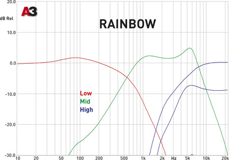 Осевая АЧХ на средних частотах имеет характер аудиофила. Несмотря ни на что, в промежутке от 3,5 кГц до 8 кГц наблюдается наложение излучения среднечастотного и высокочастотного динамиков, что и вызвало определённое давление на «шипучку», а с противоположной стороны поспособствовало утере «сочности» басового барабана. Но есть большая доля вероятности в том, что при правильной установке среднечастотных и высокочастотных головок этот отрицательный эффект можно будет удалить, во всяком случае – минимализировать.