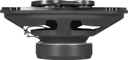 Данная автоакустика соответствует всем правилам и традициям, которые приняты в компании. В частности, это касается диффузора мидбаса, который выполнен из металлического сплава и выкрашен в один из фирменных цветов компании. Несмотря на это корзина так и не смогла избавиться от резонансов на низких частотах. Для защиты массивного магнита (90*20 мм) используется литой резиновый чехол. Рамка защитной решетки крепится к ободу корпуса. Роль звукопоглащающего элемента выполняет поролоновое кольцо. Мидбас и высокочастотники подсоединены к электронной части по второму способу. Как говорилось ранее, мембрана основного твитера выполнена из металла и ее диаметр составляет 60 мм, купол супертвитера в два раза меньше. Центральную часть «супера» закрывает круглое фазовыравнивающее тело без апертуры. Обойма пищалок закреплена не жестко, благодаря чему ее можно поворачивать в любую сторону, на угол, не превышающий 20 градусов. Такой особенностью может похвастаться далеко не каждая автоакустика.
