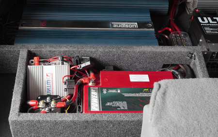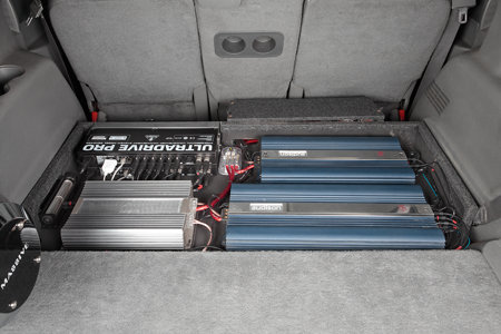 Для того чтобы в дальнейшем не возникало никаких проблем с использованием багажного отделения, специалисты расположили соответствующие усилители в ранее подготовленные места. Для этого был оборудован соответствующий короб. В его же в дальнейшем расположили качественный процессор, а также инвертор, позволяющий регулировать питание. Наличие аккумулятора дает возможность подпитывать системы в автономном режиме. В состав системы специалисты также решили включить соответствующий конденсатор, с помощью которого можно было бы минимизировать негативное влияние влаги и тепла.