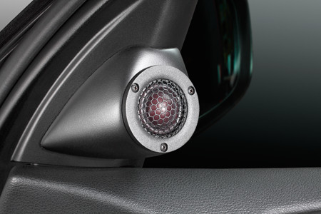 Установка среднечастотников Morel Hybrid MW4 была произведена практически в штатные места, т.е. там же физически, однако с фиксацией к дверной карте, а не к обивке. Для них выделили объем акустики (почти литровый стеклопластиковый «стакан»), который полностью изолирует их от влияния мидбаса. Установка пищалок ScanSpeak D3004/602000 выполнили в зеркальных треугольниках по проверенной схеме – практически на месте штатных, однако в подиумах с доворотами в сторону слушателей.