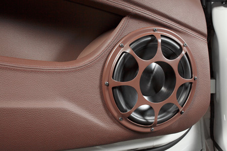 Мидбас фронта – Morel Elate MW 9. 9-дюймовый калибр, как ясно из обозначений. В описании второй системы я этого не упоминал, подобные мидбасы – единичное явление. И именно здесь оно явилось… В процессе установки в дверь резонансная частота равняется 40 Гц при добротности 0,5, а это является залогом точного фронтального аудиофильского баса. Для проведения монтажа динамиков основательно поработали с дверями – полное вибродемпфирование (четыре слой STP Gold), отверстия заглушили стеклопластиковыми панелями, установили опорные кольца фирменного оранжевого цвета (ведь говорилось, авторская манера). И, конечно же, кардинально переделывали облицовку дверей, для автоакустики мидбаса от природы не предназначается – урезание кармана, установили грили и перетягивали кожей. Кожа выписывалась «родная» немецкая, по VIN-коду.