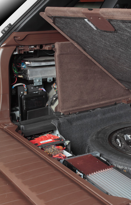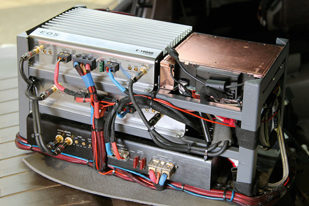 Однако главный блок, включающийся CD-ресивера и дисковый привод, нелюбимый заказчиком, компактно установили с фронтальными усилителями в сделанной «этажерке». Для нее было определено место под фальшполом багажника, вблизи запасного колеса. Предельно короткими вышли межблочные соединения, а всю конструкцию аккуратно смонтировали в комфортных условиях «на столике» и отложили в собранном виде. В процессе установки в машину нужно было лишь присоединить автоакустику и провода питания, для этого не приходилось принимать позы из «Камасутры».