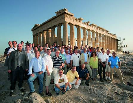 Это Парфенон в греческих Афинах. Сложности состоят в том, что Торальф (это имя друга, он норвежец и фотограф) в течение 20-ти лет пытался сделать фотографию Парфенона таким образом, чтобы в кадре не было ни людей, ни подъемных кранов. Не смог. Люди – состав EISA. С помощью подъемных кранов уже несколько лет исправляется шедевр античной архитектуры в тех участках, где он разрушен. Итоги работы заметны по пятнистым колоннам. Оказывается, что даже классическое необходимо подправлять в некоторых местах.