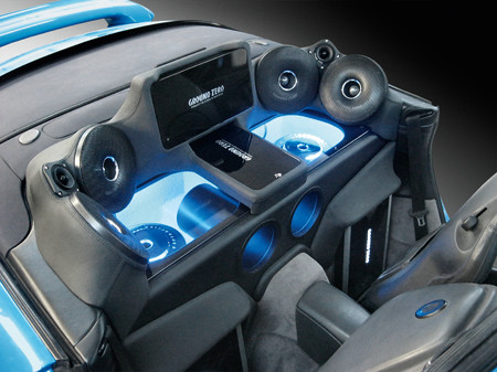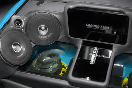 Тыл. В данном автомобиле разделение на тыл и фронт достаточно условное, так как все образует определенную центральную звуковую точку, которая проявляется издали. Здесь также использован парный комплект 8-юймовых головок GZCM 8-4PP, но теперь они среднечастотные, а не широкополосные. Более интенсивную помощь им оказывают пищалки рупорного типа GZCT-1800. Вопросами разделения полос частот в двух ситуациях занимаются пассивные кроссоверы GZCX 130/160. Вопросами баса занимается пара сабвуферов модели Grond Zero GZRW 30SPL-Extreme. Каждый из них 30-сантиметровый и они оба Extreme. Стоит заметить, что случайно сабвуферы так никто называть не будет. У каждого из них собственный корпус-бандпассе, относящийся к четвертому порядку. Для того, чтобы направить звук в центр, секции катушек звука получили параллельное подключение.