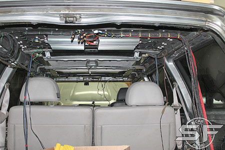 произвели обшивку алькантарой весь верх и потолок салона, выполнили подключение