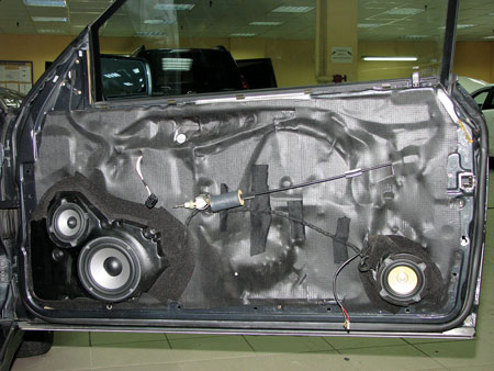Автоакустику также требовалось спрятать по стандартные места, а они как и стандартная автоакустика у S600C достаточно смешно сделана. В дверях установлены 3 головки различного формата. Огромная, низкочастотная расположена в замкнутом пластиковом 5-литровом, а его верхом предусматривается гнездо для среднечастотника с глухой корзинкой, без окошек, т.е. образовывает маленький замкнутый объем. Сзади двери – 2-ой пластиковый бокс, где размещена тыловая штатная автоакустика.