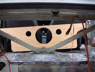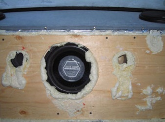 После этого была выполнена установка перегородки, которая бы надежно отделяла багажный отсек и салон. В ней сформировали отверстия непосредственно под динамики, а также фазоинверторы.