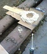 намазываем клей. Под 1 край кольца сверху подкладываем фанеру для получения
